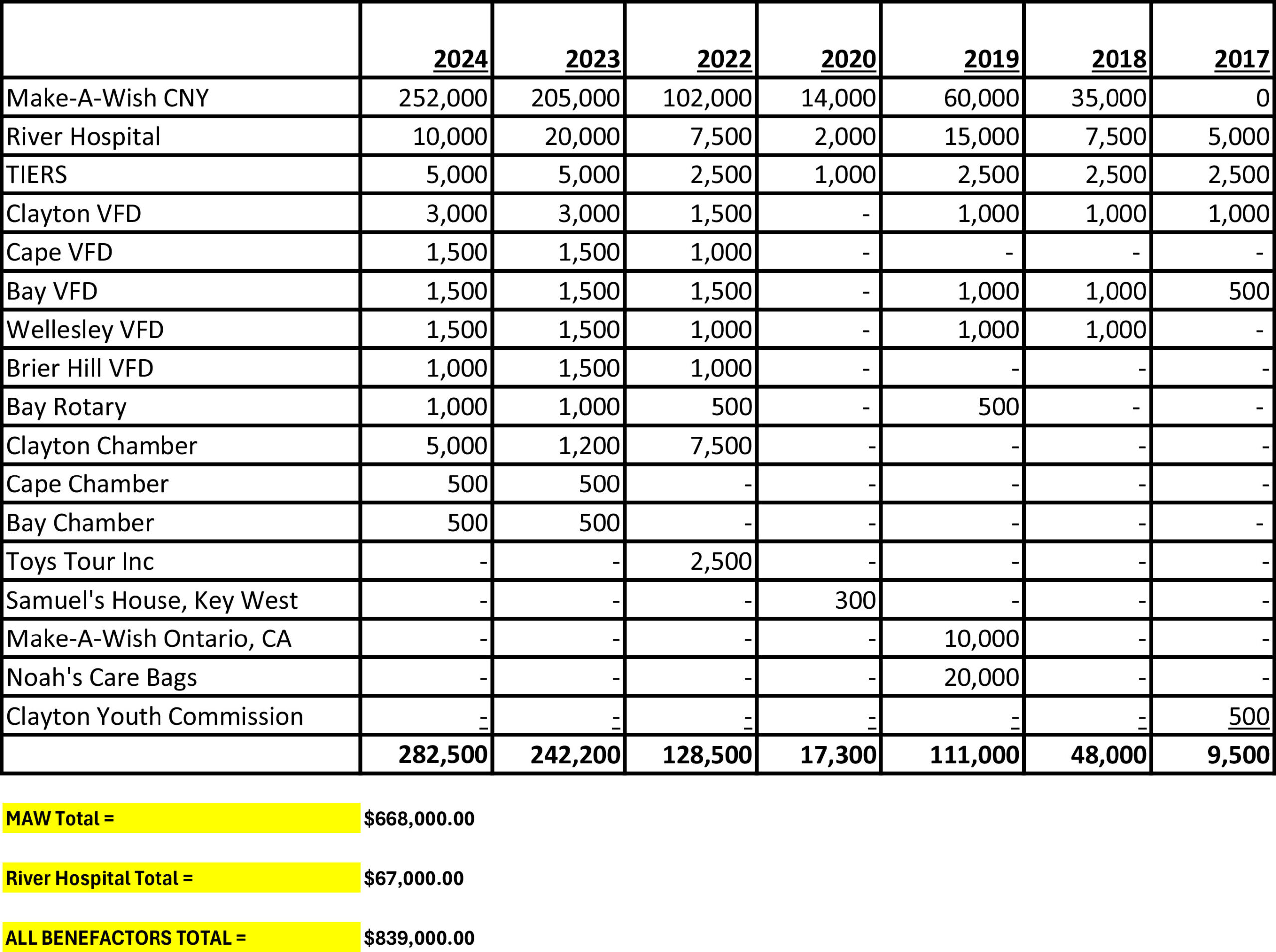 Make-A-Wish of Central New York: $252,000 | River Hospital: $10,000 | Clayton Chamber of Commerce: $5,000