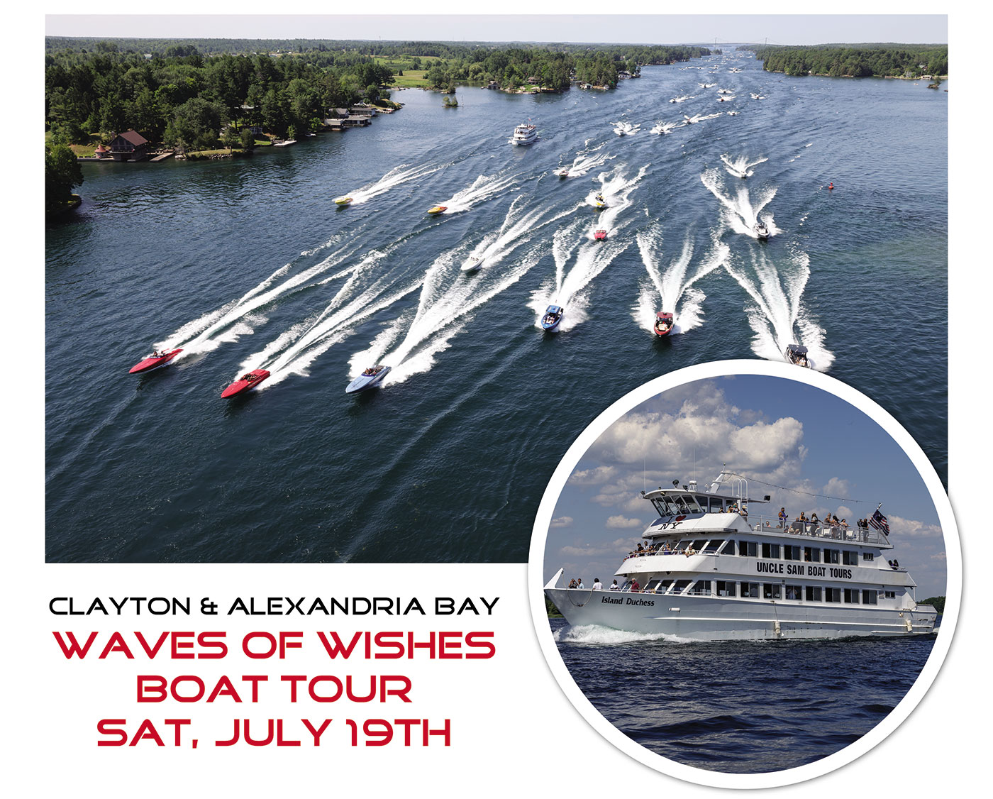 Uncle Sam’s Boat Tours has teamed up with Make-A-Wish Central New York, River Hospital, and the 1000 Islands Charity Poker Run to offer TWO Poker Run boat tours. On Saturday, July 19th, 2025, you can cruise the MORNING RUN leaving Clayton at 10:00am and returning by 11:45am. This will allow you to see all the boats leave Clayton at speed and then return from the Cape en route to Alexandria Bay for lunch. You also have the option to cruise the AFTERNOON RUN leaving from Uncle Sam Boat Tours in Alexandria Bay at 1:45pm. This tour allows you to be in position to see the boats leave lunch from Alex Bay and returns by 3pm. All proceeds go directly to Make-A-Wish Central NY & River Hospital!